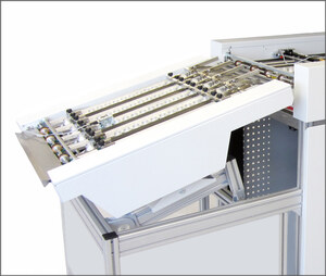 Cuerpo de plegado adicional desmontable con dos bolsas. Aumenta la varibilidad de plegado. Con la KF 31 se puede ampliar un cuerpo de plegado estándar por dos bolsas, permitiendo más variantes de plegado. El diámetro pequeño de los rodillos permite pliegues pequeños hasta 18 mm. Por eso es muy apropiado para plegar folletos informativos utilizados en la industria farmaceútica.